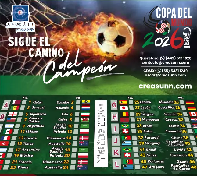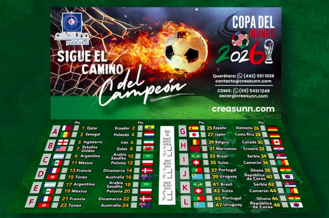 En Creasunn, ofrecemos el Calendario Tipo Cartera de la Copa del Mundo 2026, una herramienta diseñada para que nadie se pierda ni uno de los 104 partidos.